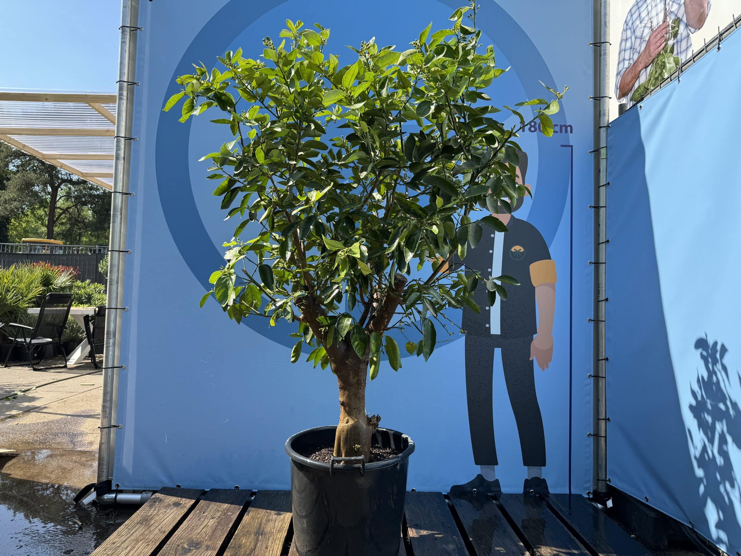 Ce citronnier, également connu sous le nom de Citrus limon, a un diamètre de tronc de 40 à 50 cm et une hauteur totale d’environ 240 cm, pot compris.